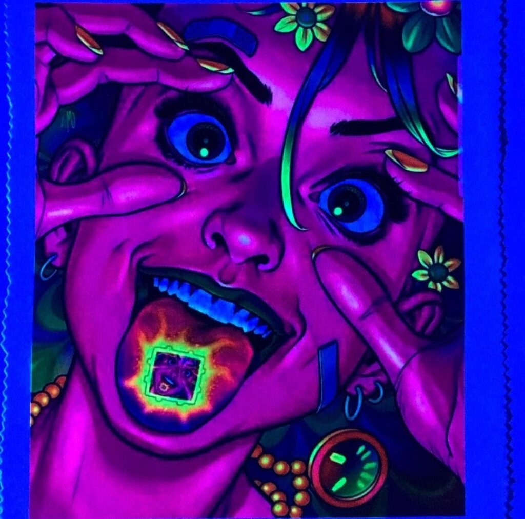 Impressão utilizando tinta sublimática fluorescente, sob a luz negra.